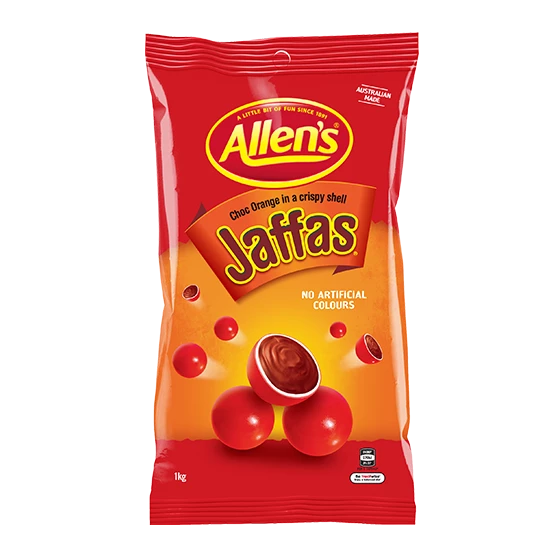 Your guests will experience this delicious sensation each and every time they bite into an Allen’s Jaffa because Jaffas lollies don’t—a delightfully mouth-watering orange-flavoured candy shell.