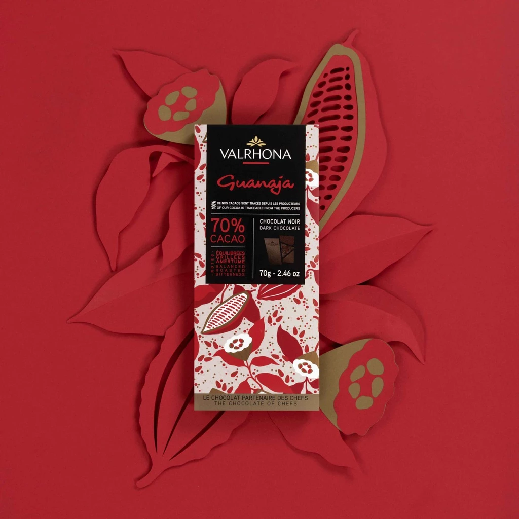 An extraordinary bitter dark chocolate bar, Valrhona Guanaja contains 70% cocoa. Its aromatic and and intense flavour gives it an elegant appeal.